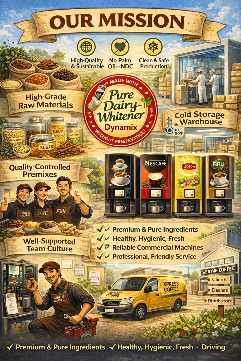 We do not use non-dairy creamers (NDC) or beverage whiteners containing palm oil. Instead, we formulate our products using pure dairy whitener (Dynamix), without synthetic preservatives or stabilizers. While this may create a price difference of approximately ₹10–15 per kg compared to low-cost alternatives in the market, it ensures a healthier and higher-quality beverage experience.